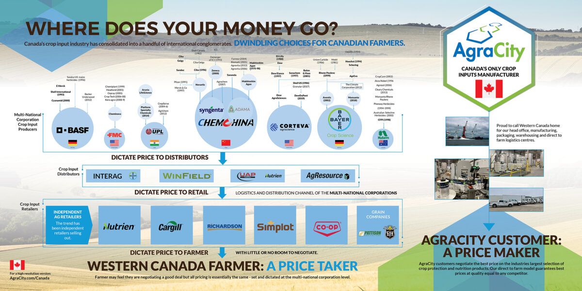 This infographic captures the consolidation in the global crop inputs landscape as well as the agriculture industry in Canada.