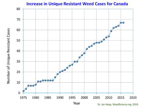 In the past 20 years, western Canada has experienced a massive increase in the number of herbicide resistant weeds, as follows: