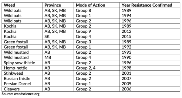 Alberta: 17 species, 22 biotypes. Most common resistant weed = wild oats. Other weeds include green foxtail, kochia, cleavers, Russian thistle, wild mustard