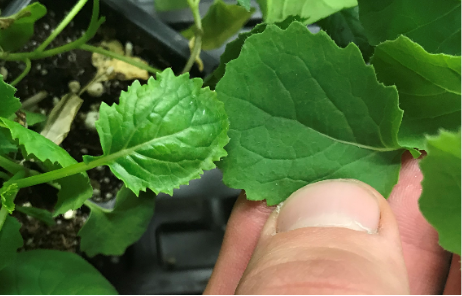 The canola plant on the left was treated with an off-label adjuvant compared to the untreated leaf on the right