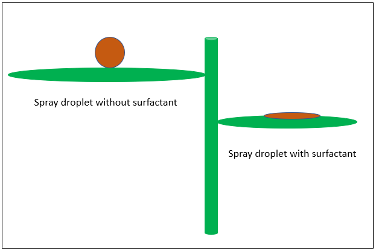 a) The surfaces of plant leaves tend to be covered in a rough, hairy, waxy layer when looked at very closely. When spray droplets hit them, they will sit on the plant leaf as a sphere, like a tiny basketball on the leaf so only a small amount of the herbicide gets into the plant. Surfactants lower the surface tension of the drop to flatten the droplet (turning the “basketball” into a “pancake”). This allows far more of the herbicide to contact the leaf and get into the weed.