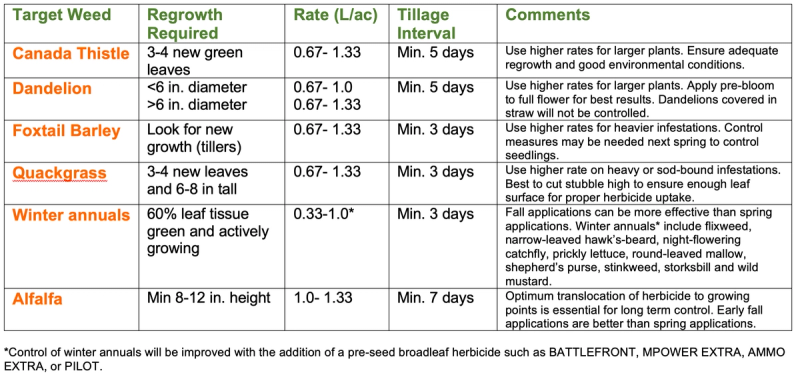 Tillage interval: Under good growing conditions, allow a minimum of 3 days after application before tillage for the herbicide to translocate in the plant as much as possible. Under cool and cloudy conditions plant growth may slow down, so it is recommended to allow more time for translocation of the product to the roots of the weed (up to 10 days).